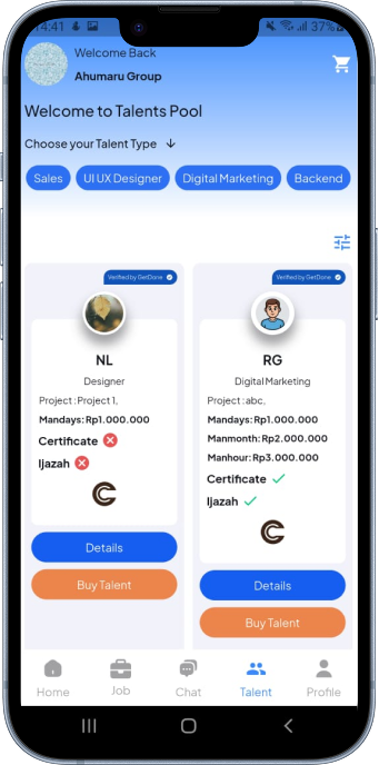 Di Get Done, Anda bisa langsung membeli talenta yang sudah diverifikasi, bukan hanya oleh AI, tapi juga oleh recruitment company yang dipilih langsung yang berperan sebagai Human Verificator di get done.