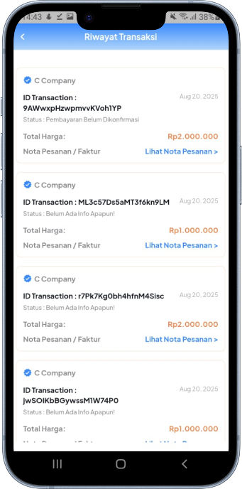 Semua transaksi tercatat rapi. Anda bisa memantau status pembayaran dan order kapan saja melalui menu “Riwayat Transaksi”.